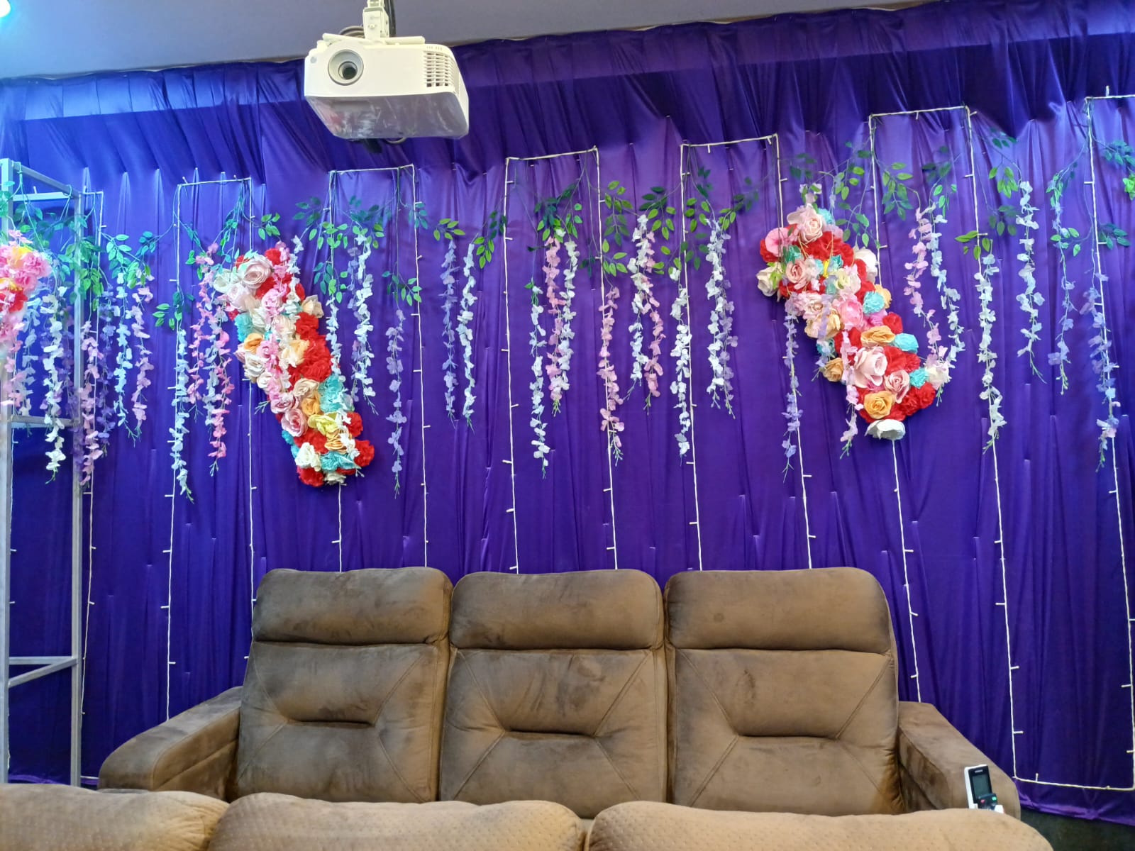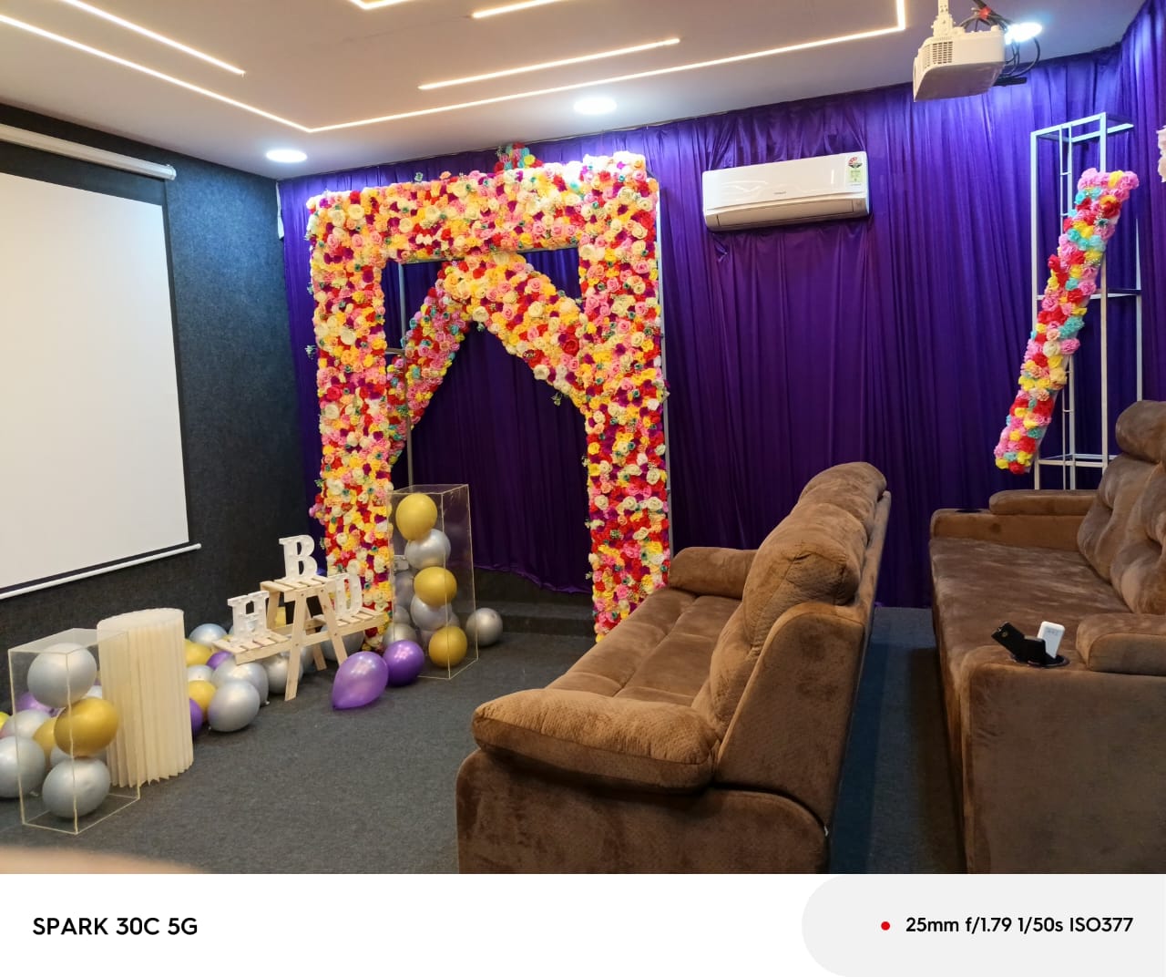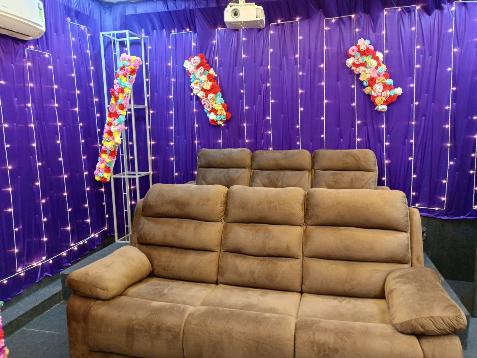 Marigold - Violet Theater • ₹299 per extra person. • Massive 120-inch 4K Ultra HD screen for crystal-clear visuals • Immersive Dolby Atmos audio delivers deep, cinematic sound • Great for couples, families, and groups of friends – perfect for any occasion