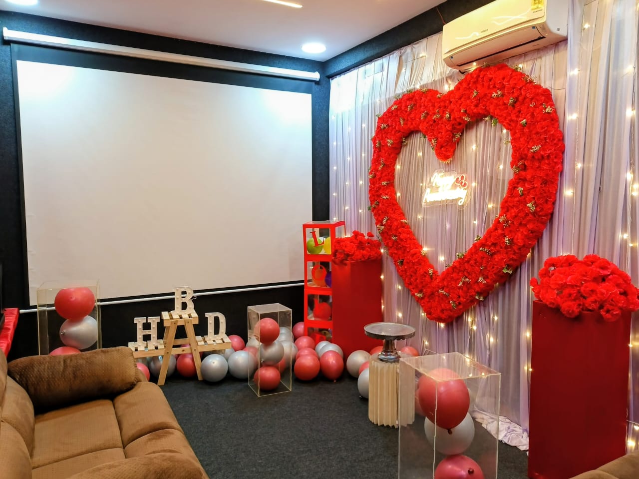 Rose - Red Theater • ₹299 per extra person. • Massive 120-inch 4K Ultra HD screen for crystal-clear visuals • Immersive Dolby Atmos audio delivers deep, cinematic sound • Great for couples, families, and groups of friends – perfect for any occasion